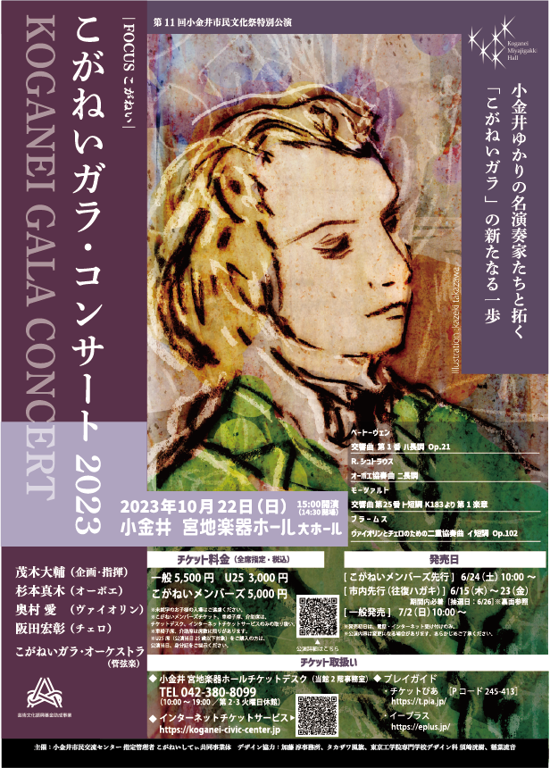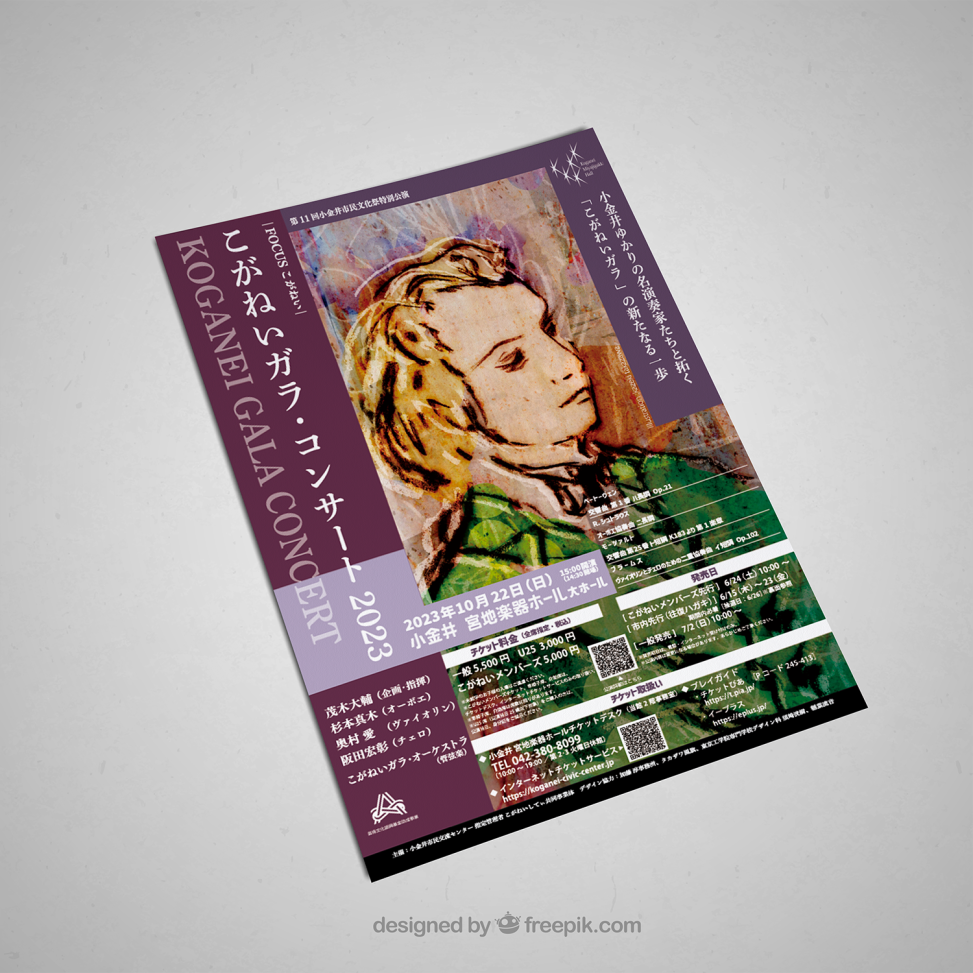 毎年、小金井宮地楽器ホールで行われている「こがねいガラ・コンサート」のチラシの制作を行い、採用を頂きました。指揮者の方が思い入れのあるブラームスのイラストを使用し、色を紫の基調色にし上品で秋らしい作品になりました。